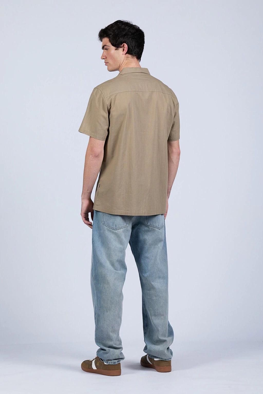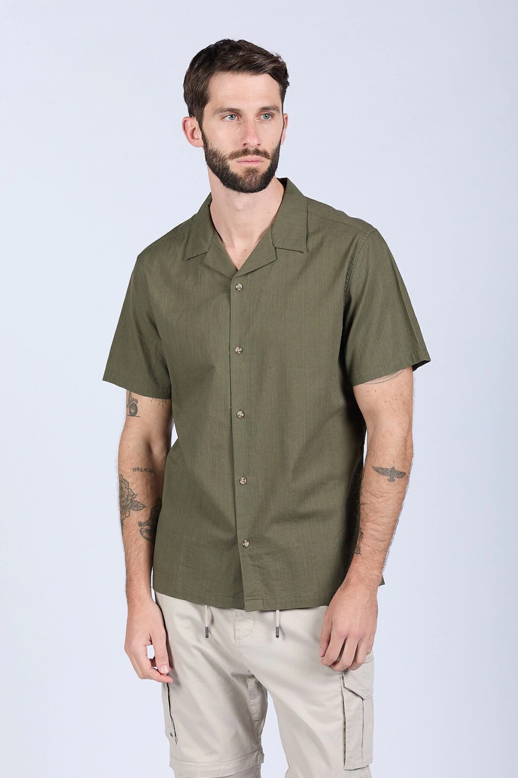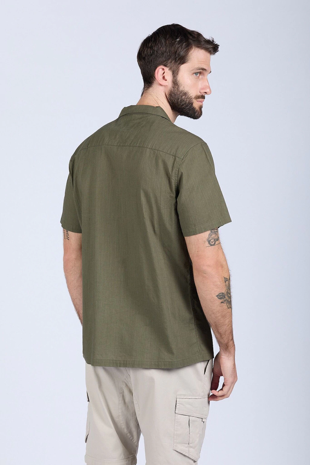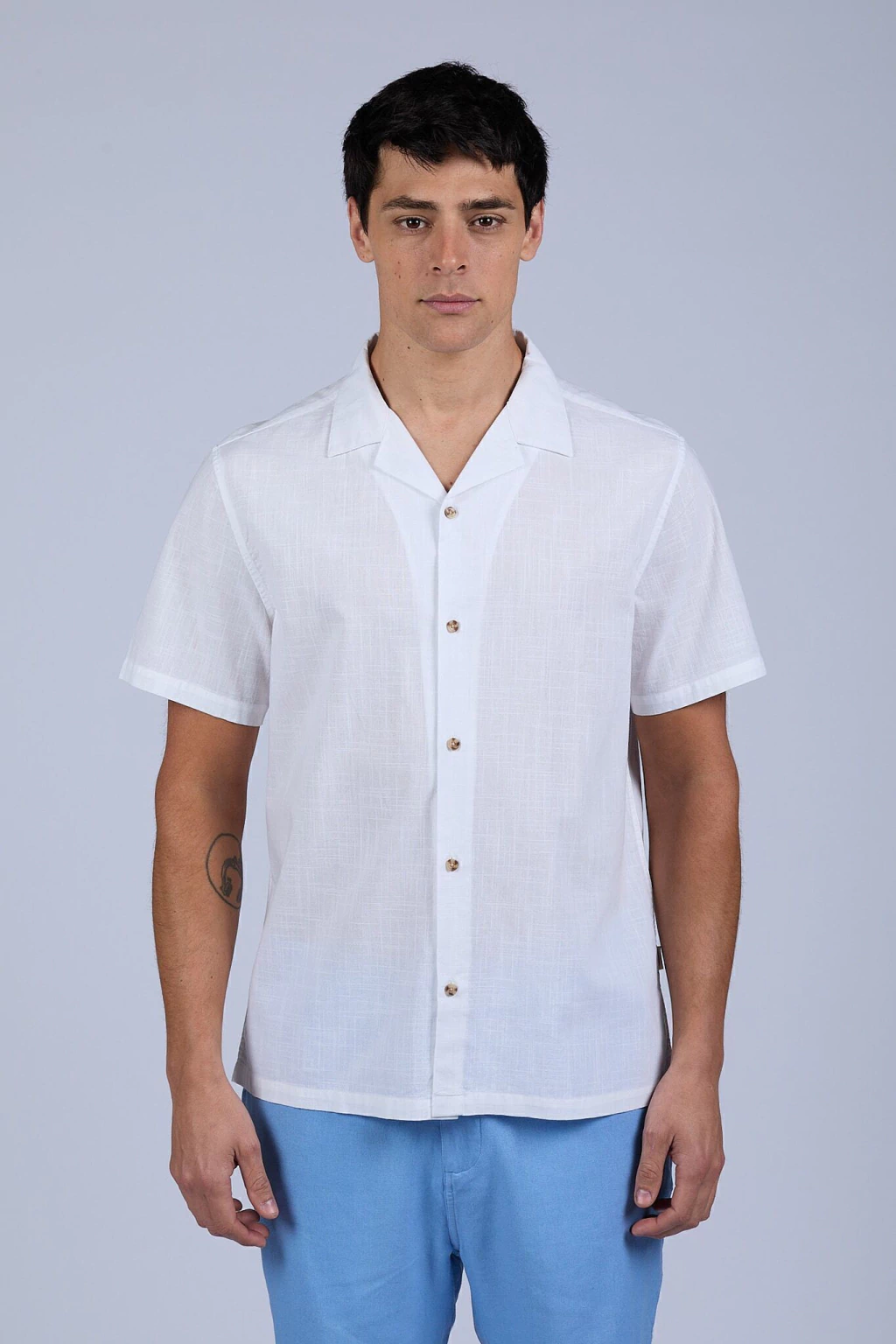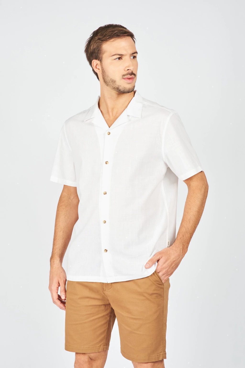 Camisa manga corta con cuello camp y botones estilo carey, confeccionada en tejido Linen Look que imita la apariencia del lino con la frescura y suavidad del algodón. Calce custom fit, con un leve entalle en el pecho que aporta un look más estilizado sin perder comodidad. Realizada en 100% algodón.