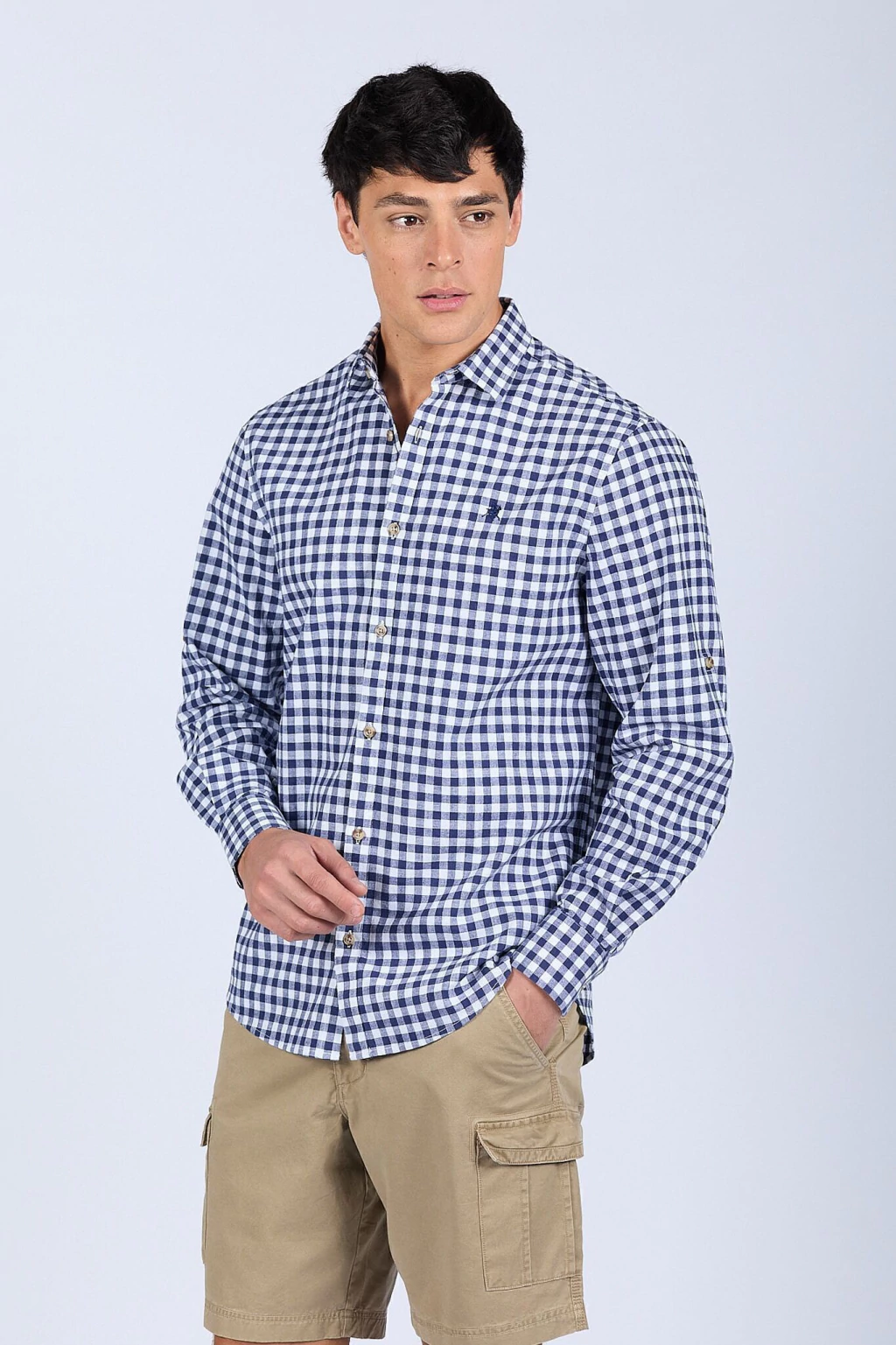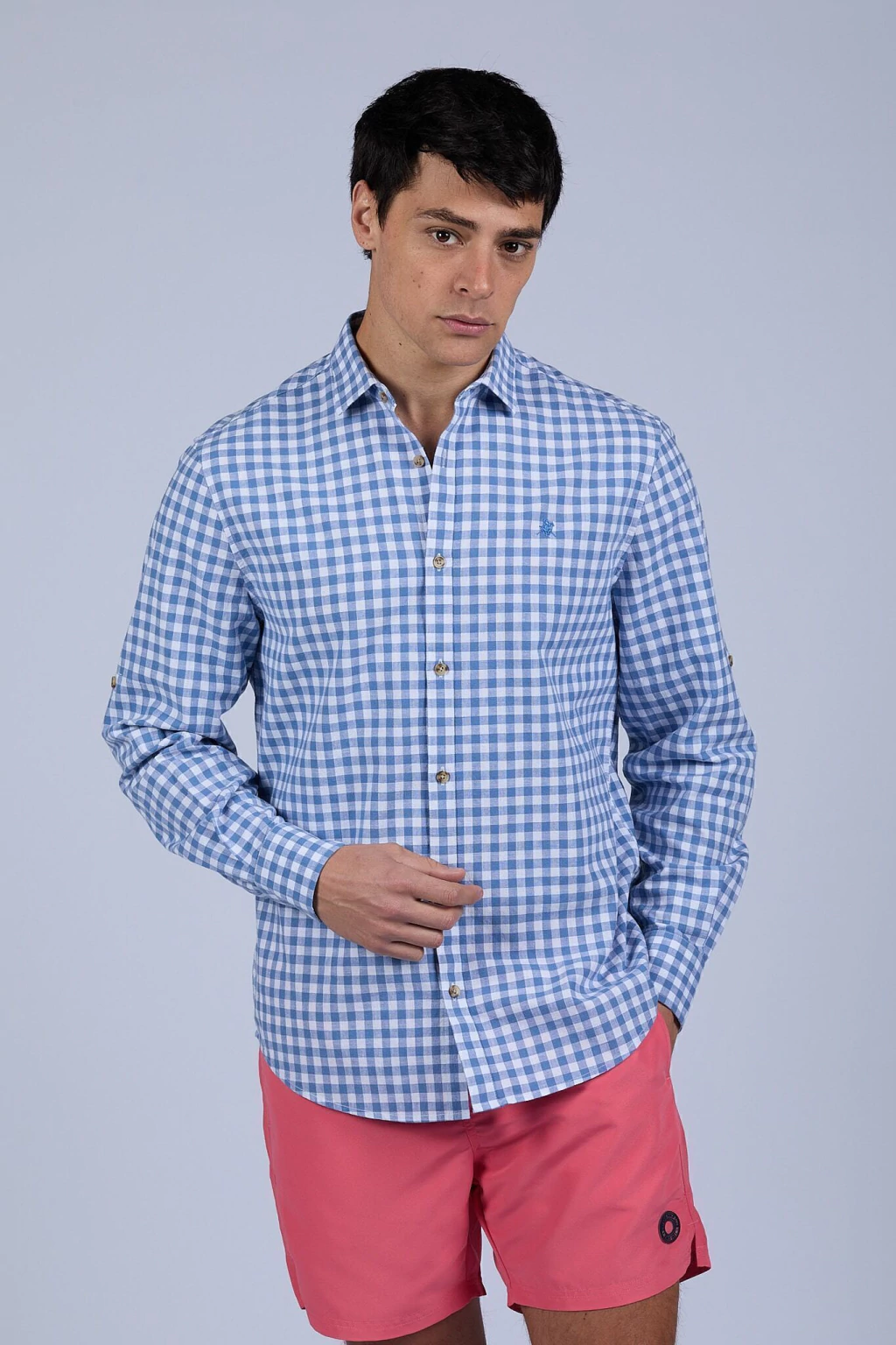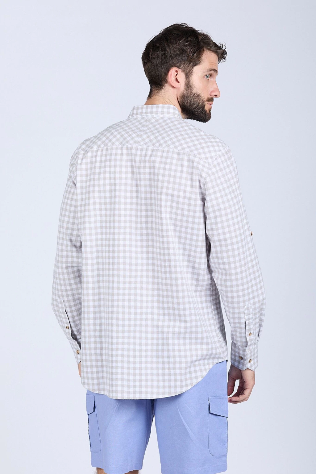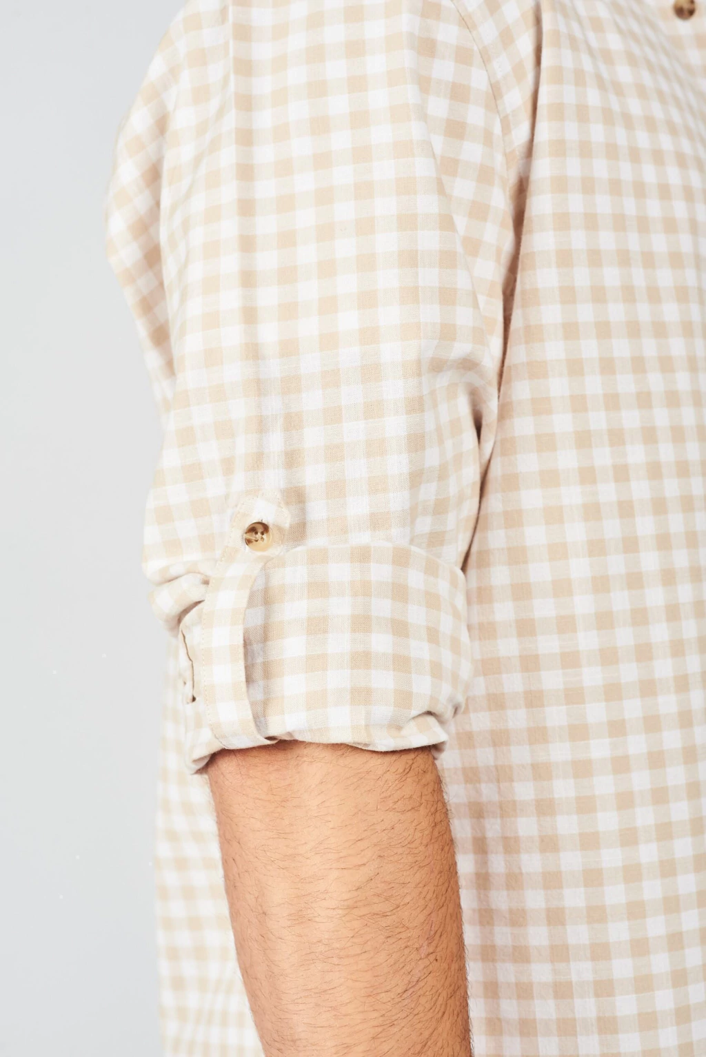 Camisa manga larga de lino a cuadros vichy con botones de carey. Calce custom fit. Cuello italiano. Traba interna para arremangar con botón.Esta camisa tiene un leve entalle a la altura del pecho que logra un calce más estilizado, manteniendo la comodidad de la prenda. Realizada en 55% lino 45% algodón.