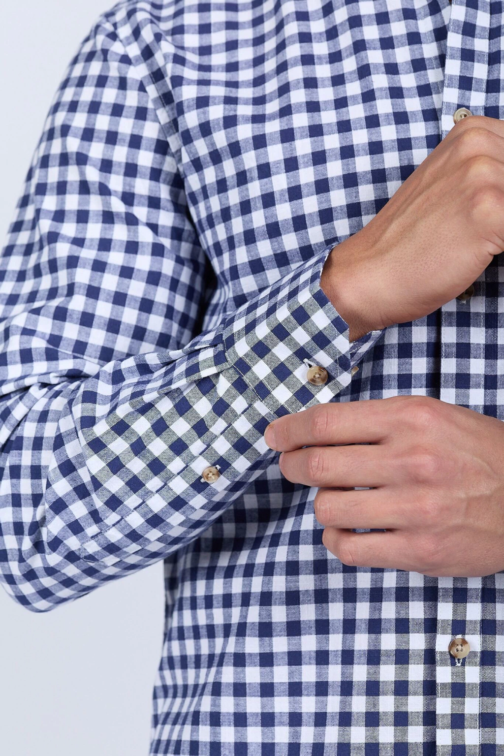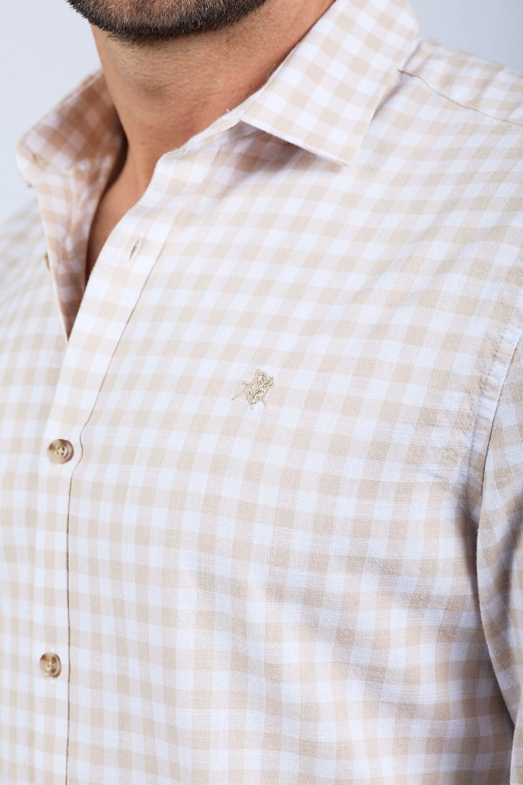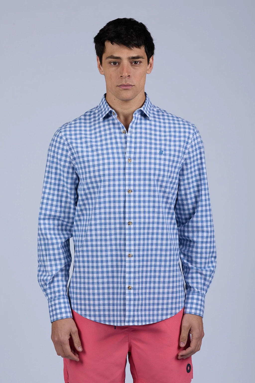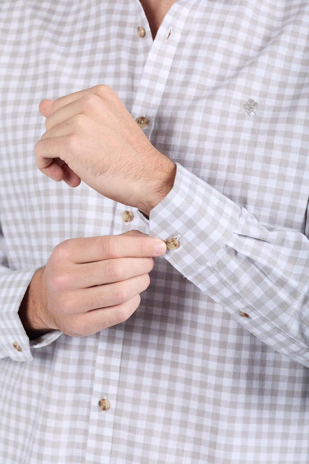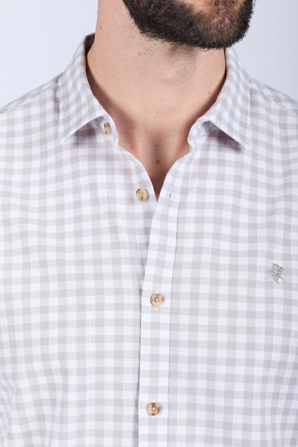 Camisa manga larga de lino a cuadros vichy con botones de carey. Calce custom fit. Cuello italiano. Traba interna para arremangar con botón.Esta camisa tiene un leve entalle a la altura del pecho que logra un calce más estilizado, manteniendo la comodidad de la prenda. Realizada en 55% lino 45% algodón.