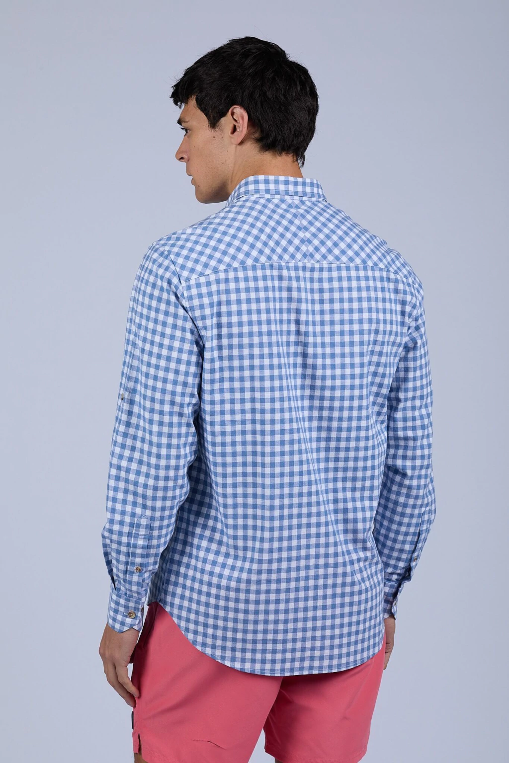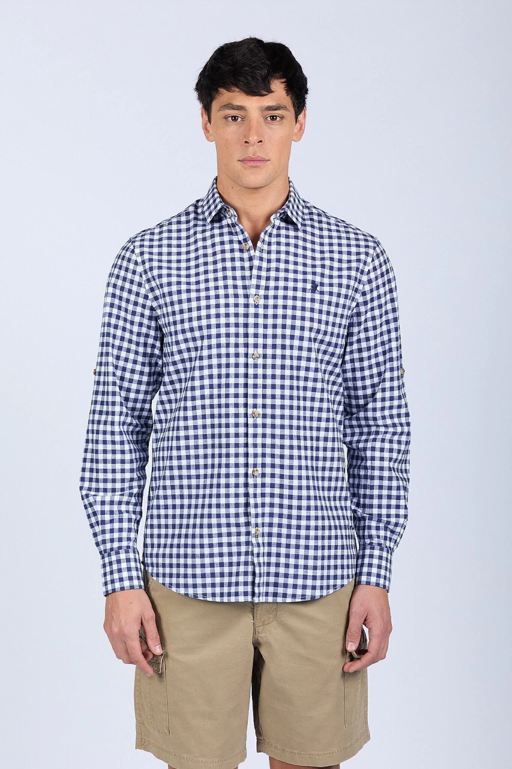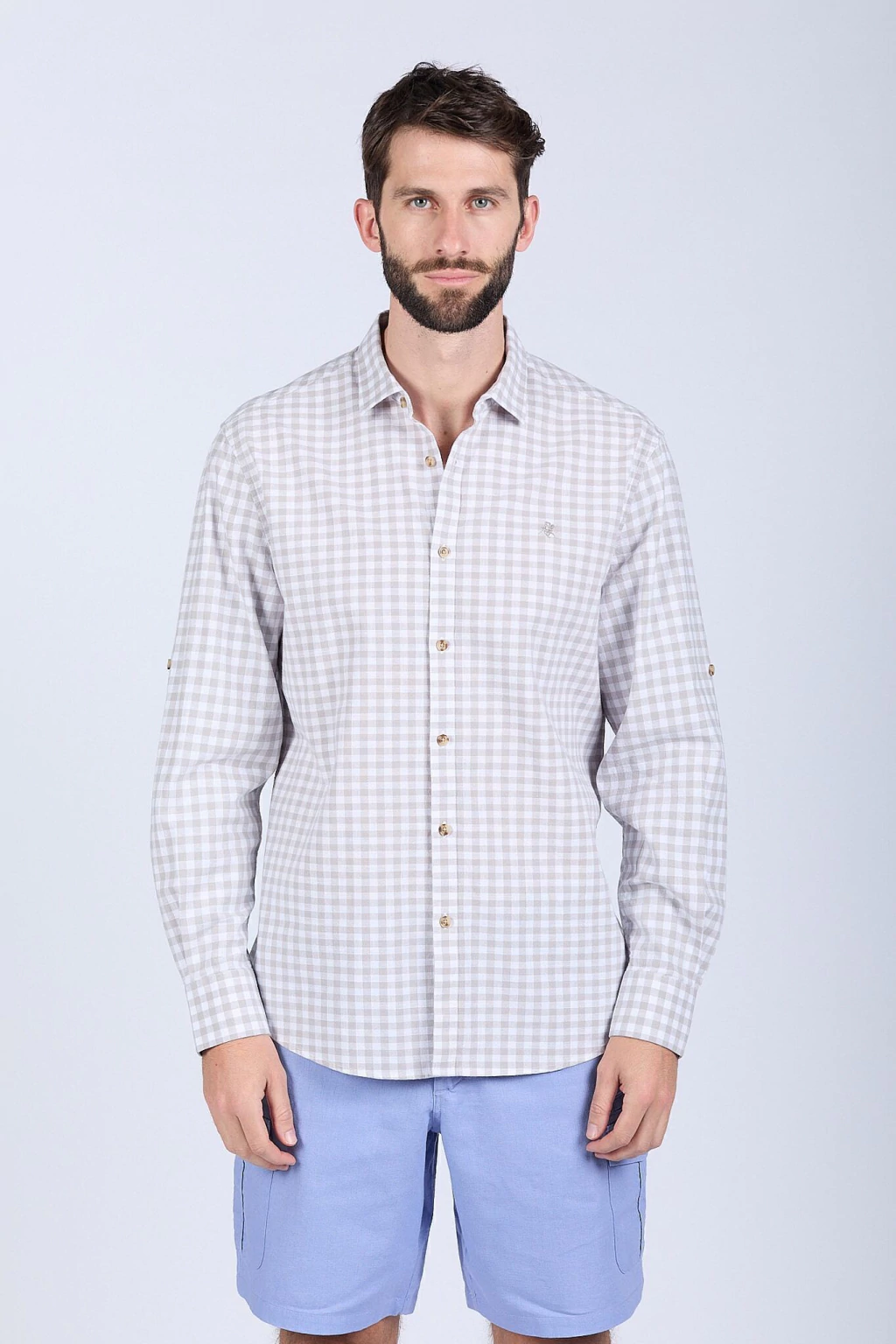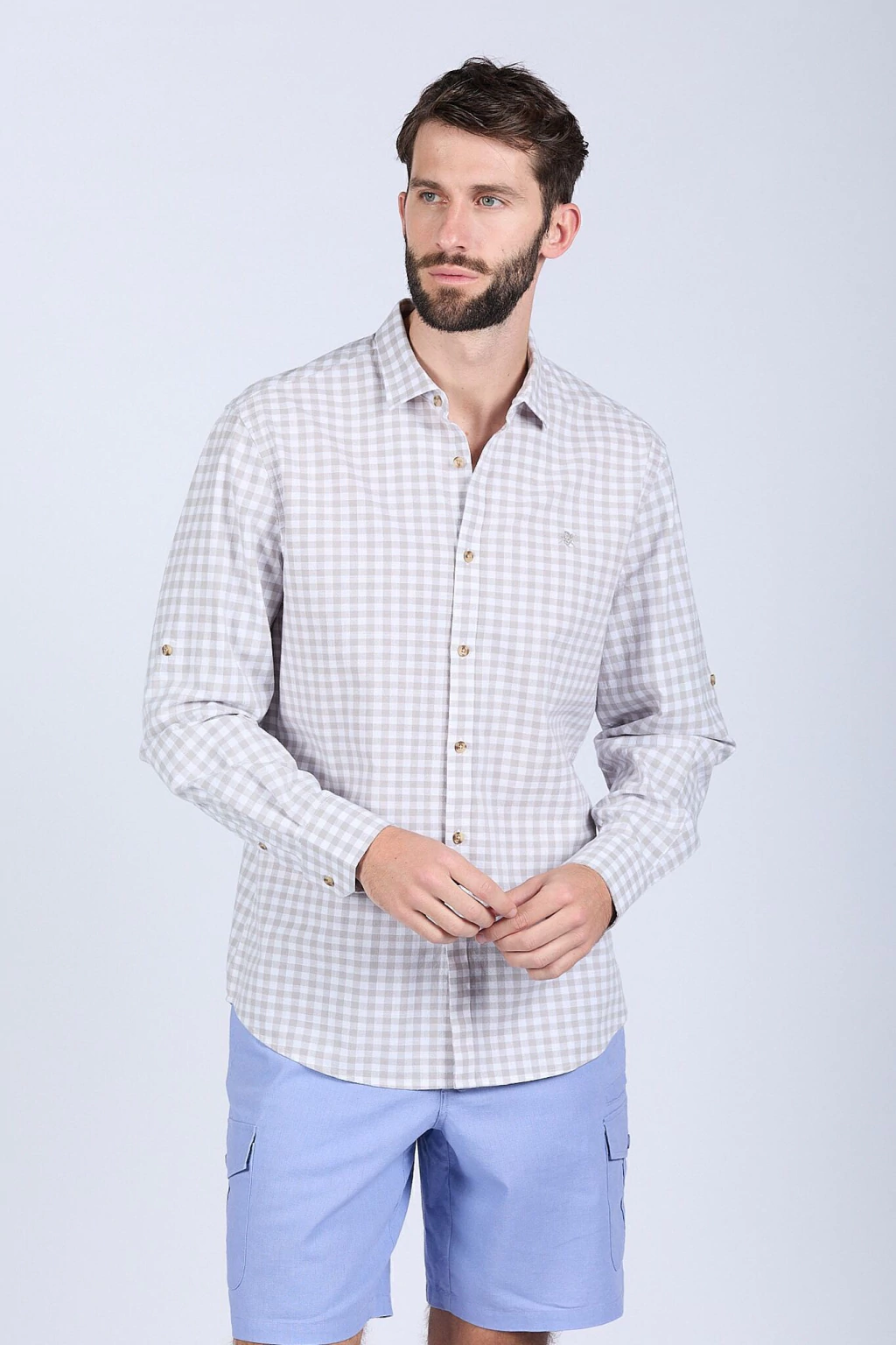 Camisa manga larga de lino a cuadros vichy con botones de carey. Calce custom fit. Cuello italiano. Traba interna para arremangar con botón.Esta camisa tiene un leve entalle a la altura del pecho que logra un calce más estilizado, manteniendo la comodidad de la prenda. Realizada en 55% lino 45% algodón.