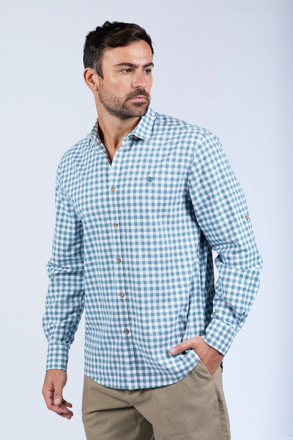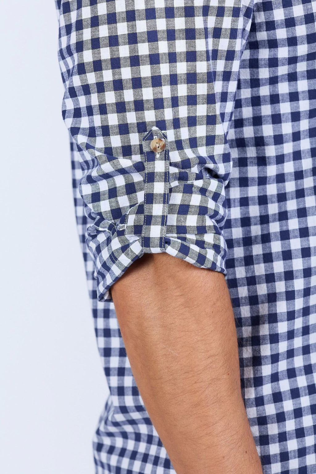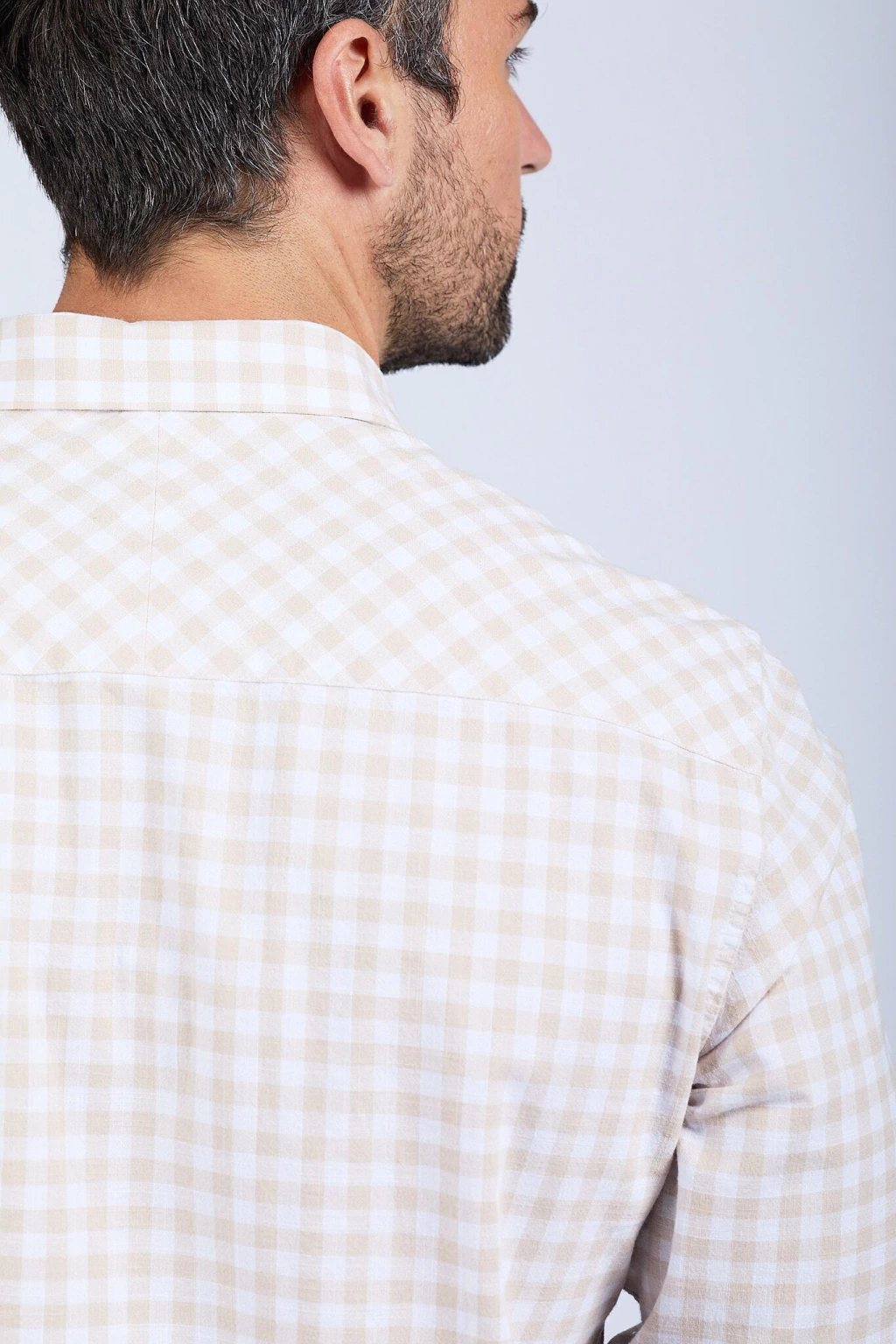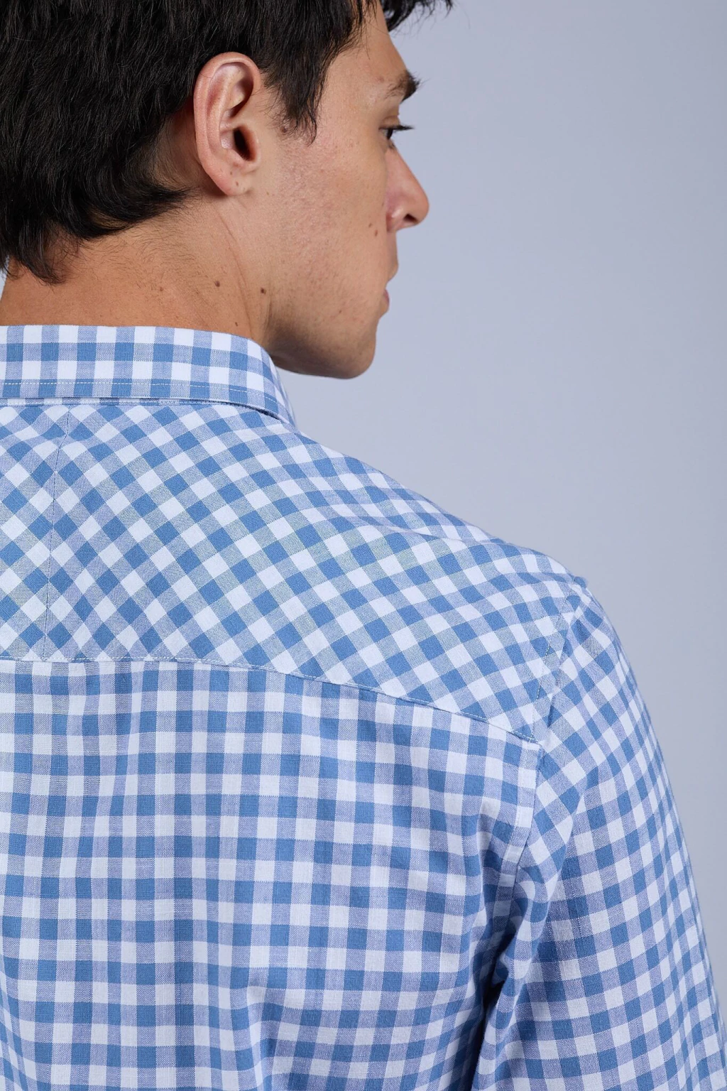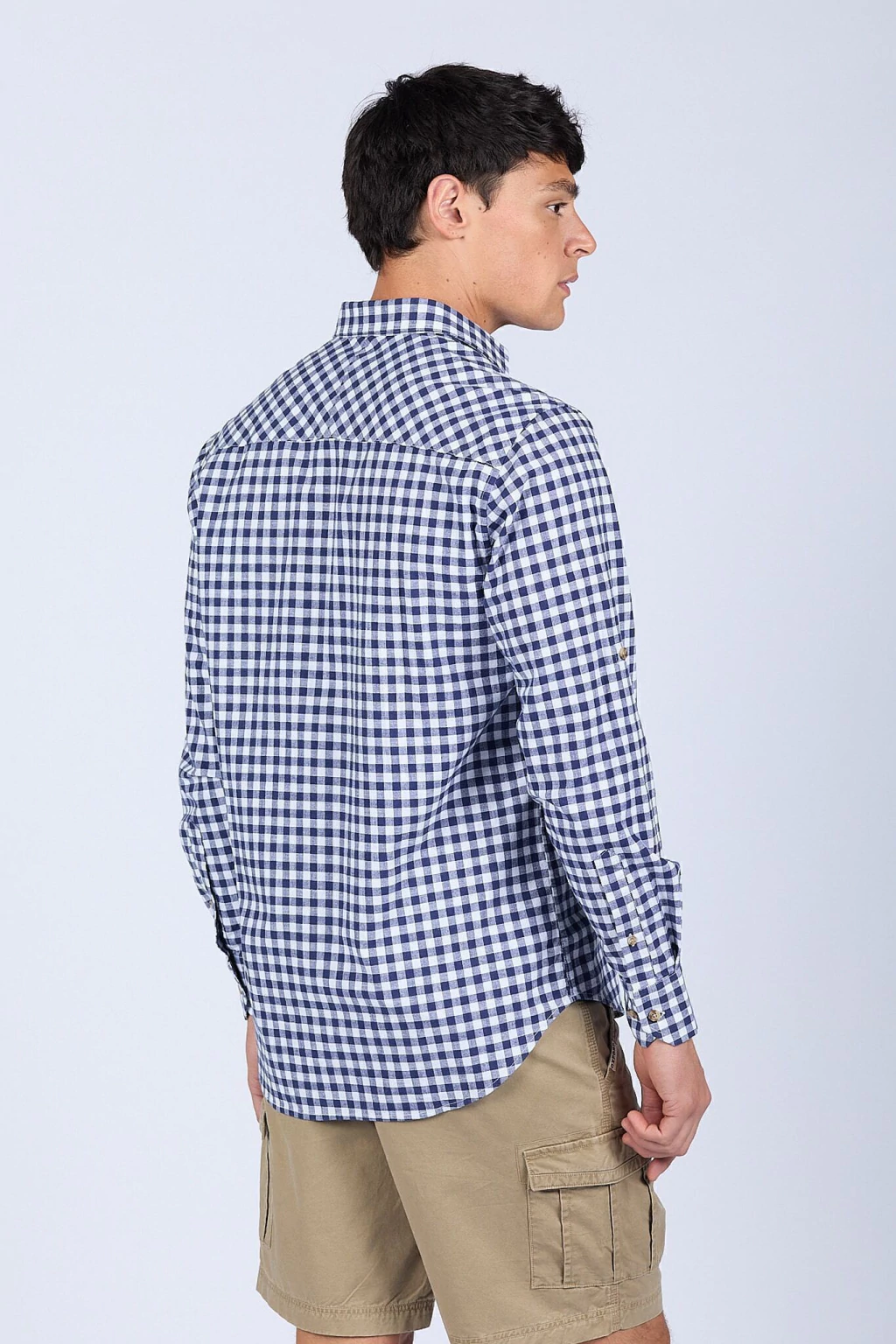 Camisa manga larga de lino a cuadros vichy con botones de carey. Calce custom fit. Cuello italiano. Traba interna para arremangar con botón.Esta camisa tiene un leve entalle a la altura del pecho que logra un calce más estilizado, manteniendo la comodidad de la prenda. Realizada en 55% lino 45% algodón.