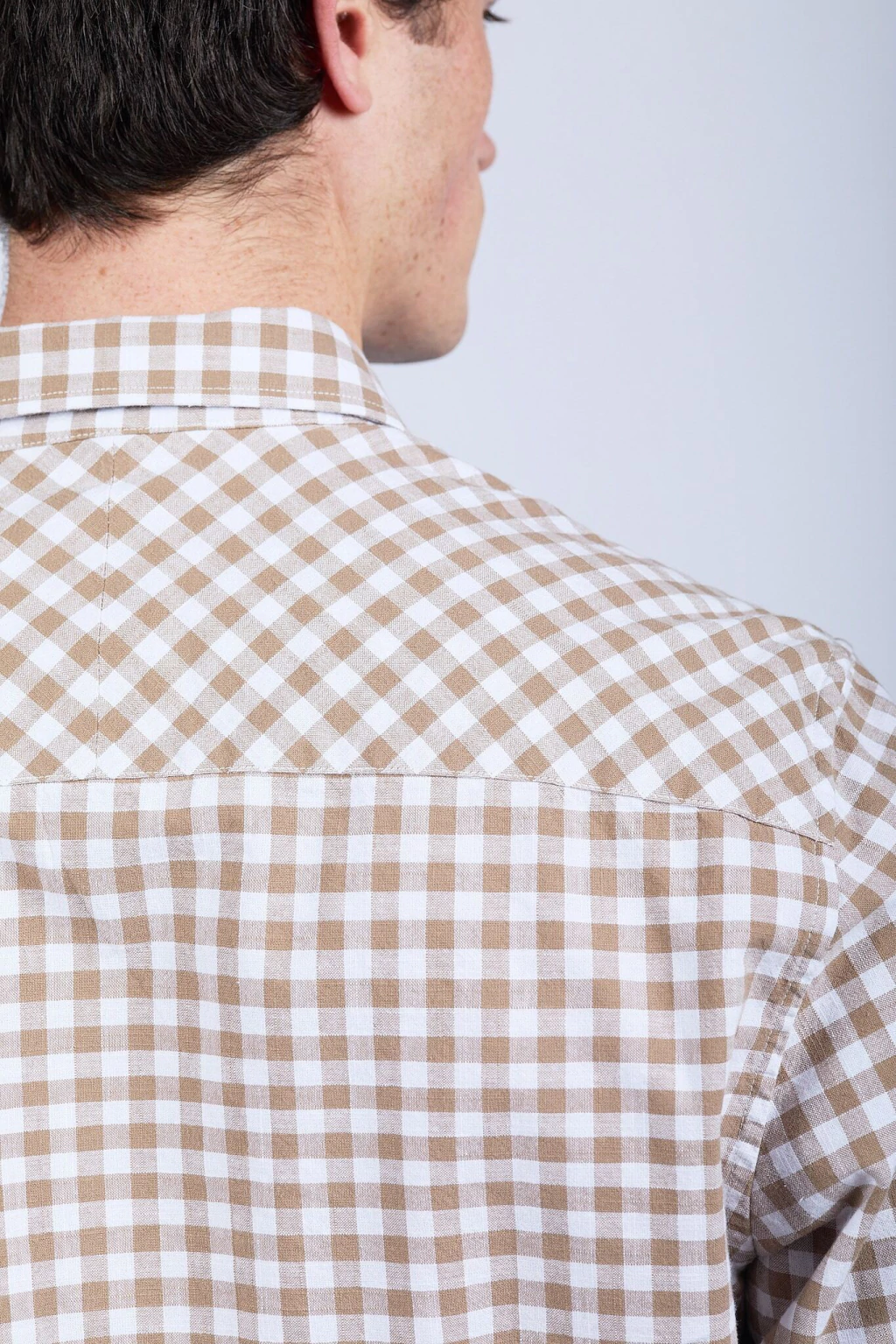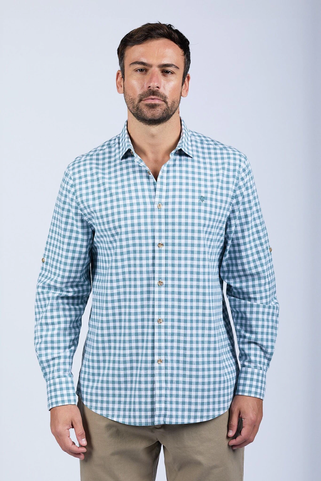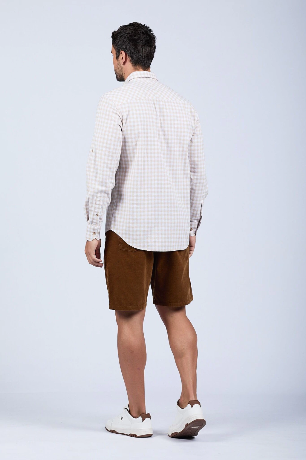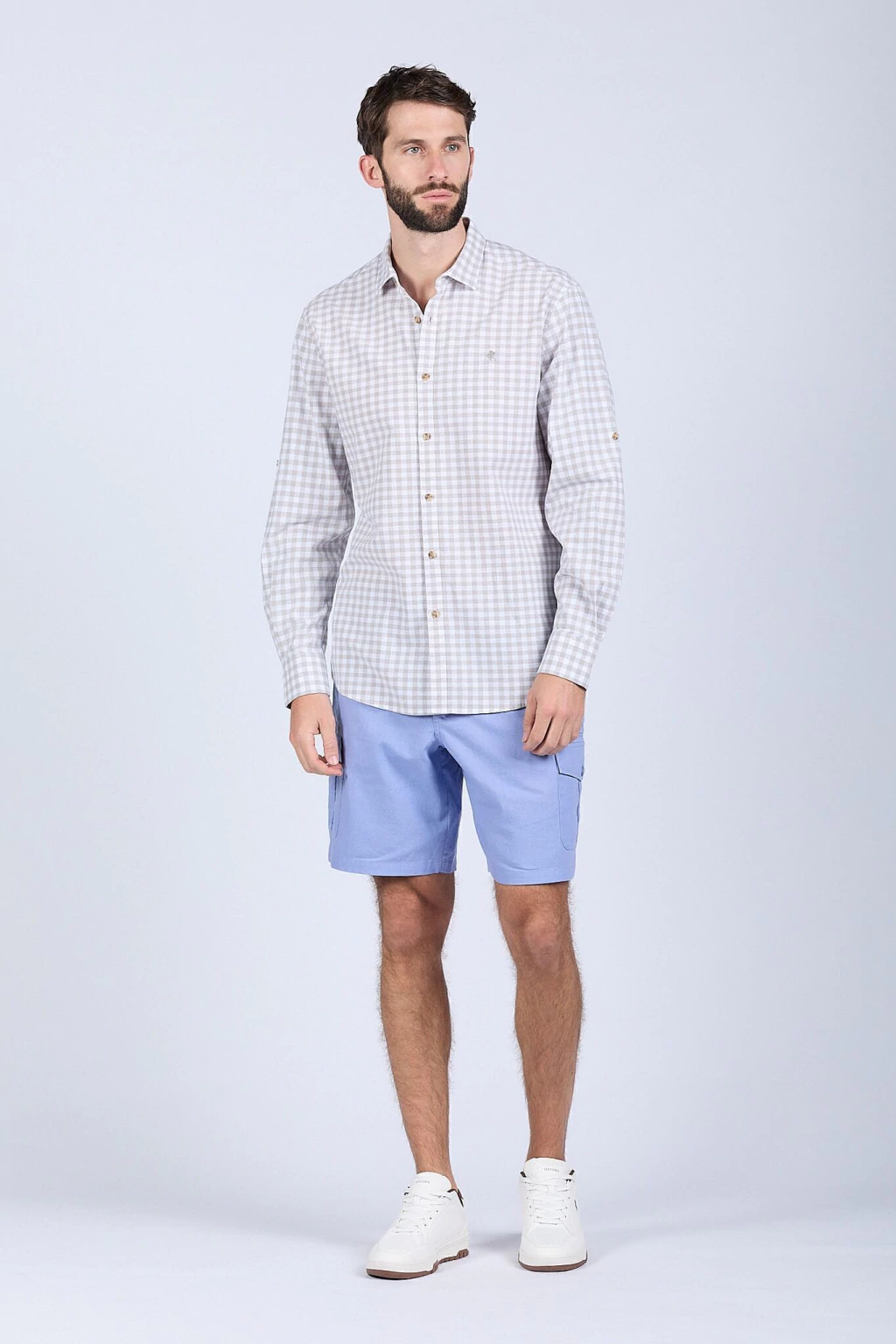 Camisa manga larga de lino a cuadros vichy con botones de carey. Calce custom fit. Cuello italiano. Traba interna para arremangar con botón.Esta camisa tiene un leve entalle a la altura del pecho que logra un calce más estilizado, manteniendo la comodidad de la prenda. Realizada en 55% lino 45% algodón.