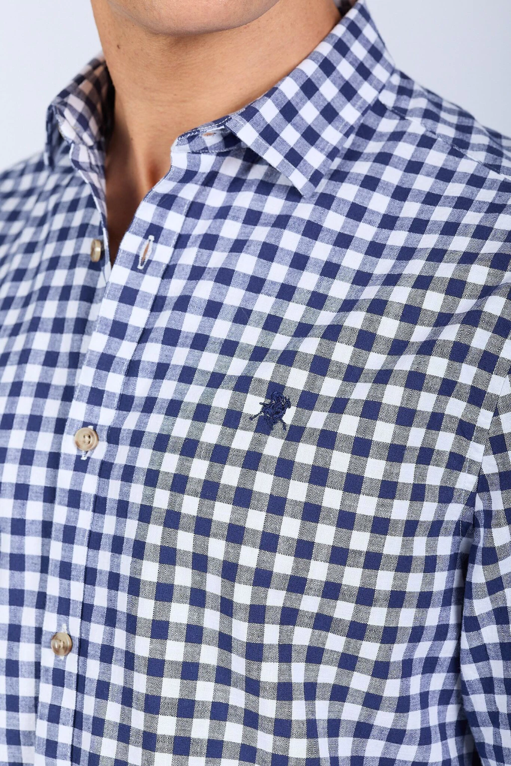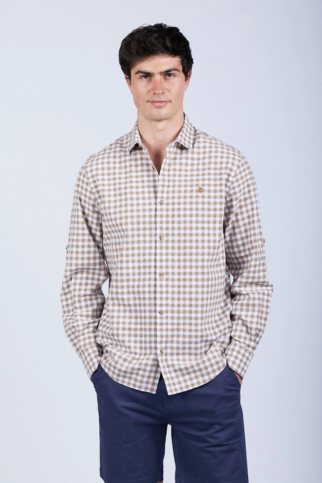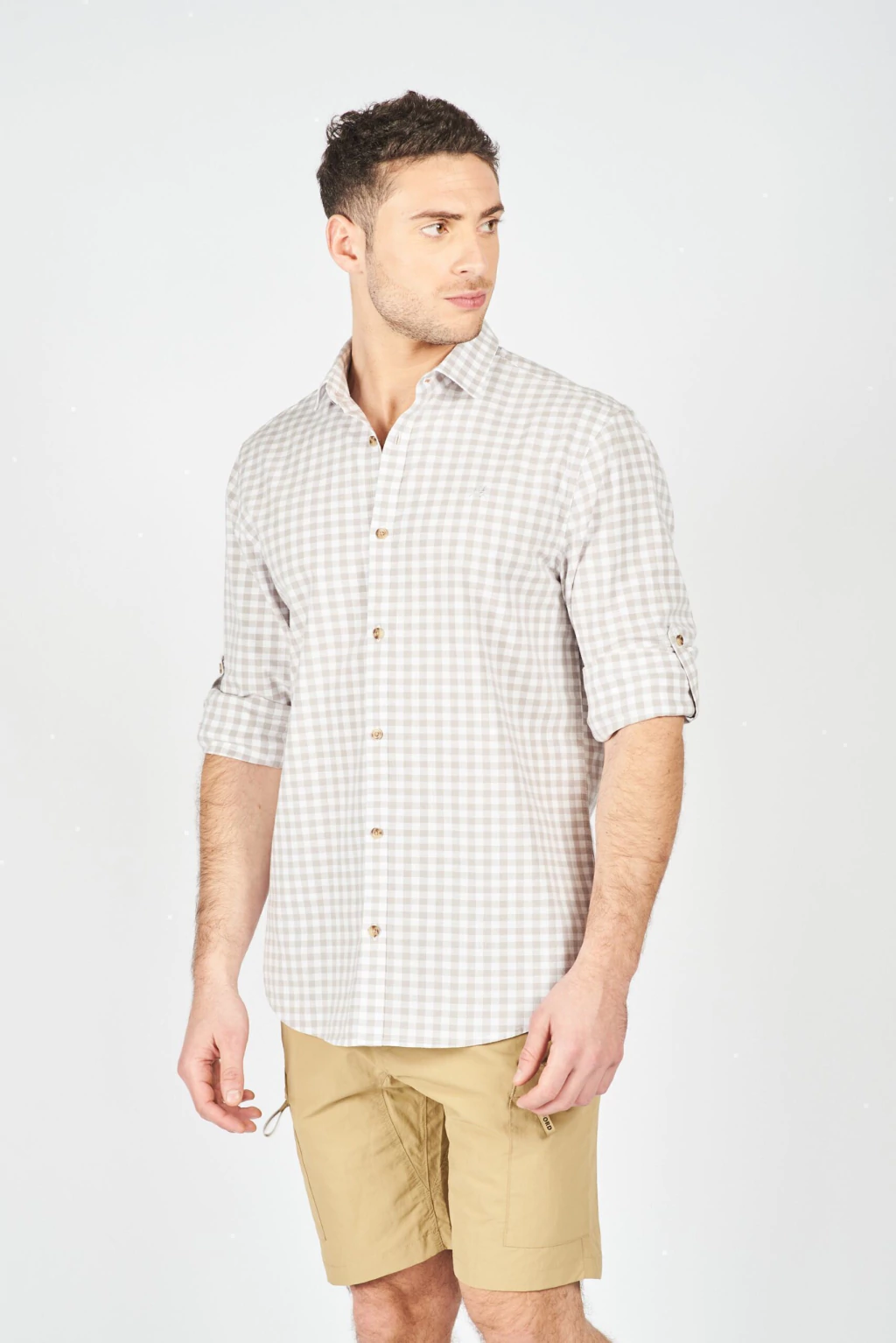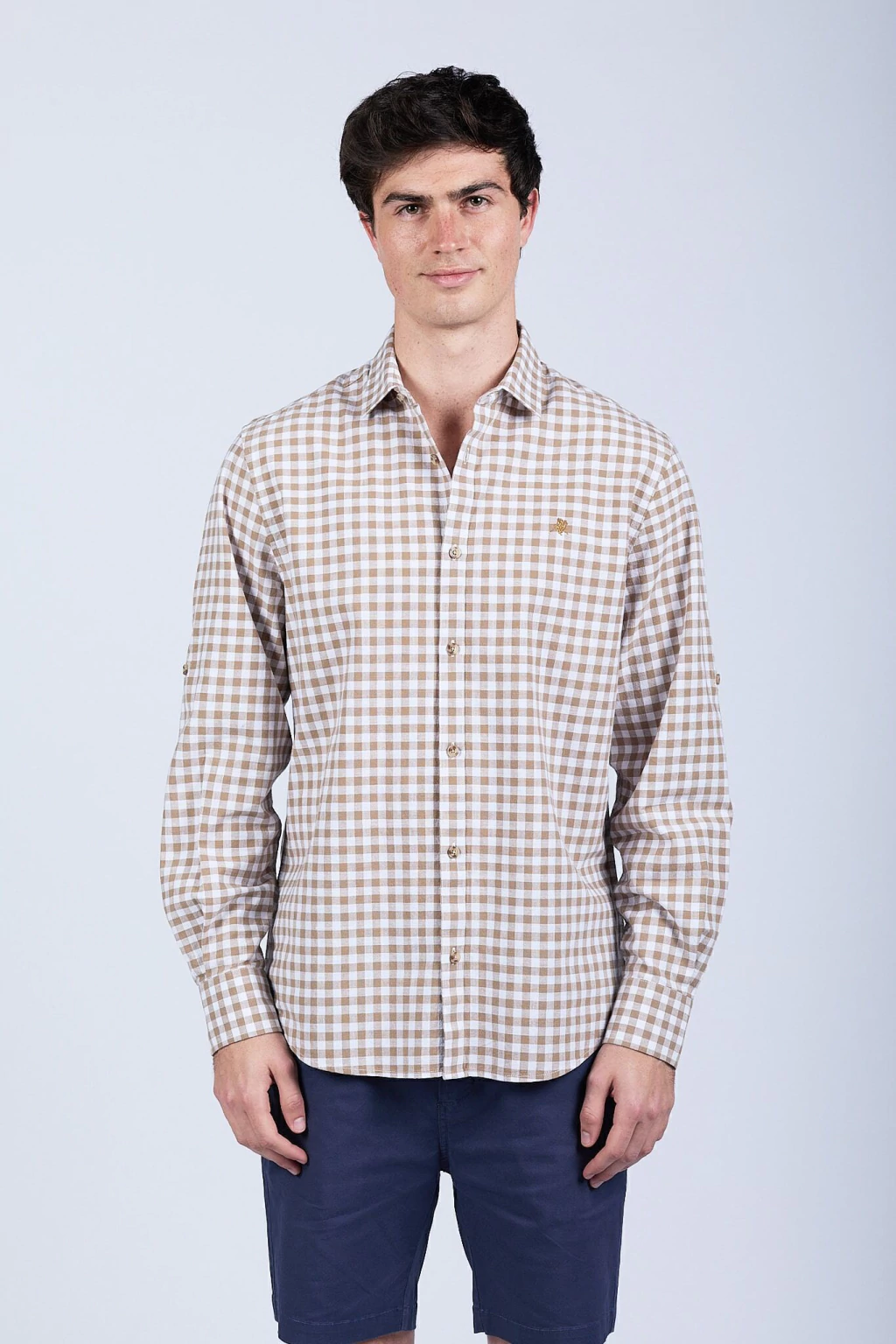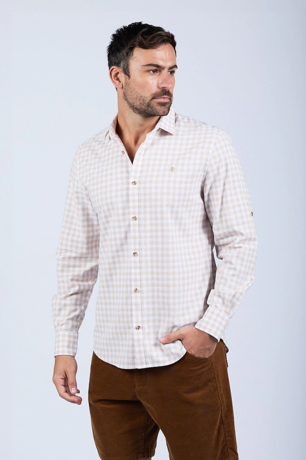 Camisa manga larga de lino a cuadros vichy con botones de carey. Calce custom fit. Cuello italiano. Traba interna para arremangar con botón.Esta camisa tiene un leve entalle a la altura del pecho que logra un calce más estilizado, manteniendo la comodidad de la prenda. Realizada en 55% lino 45% algodón.