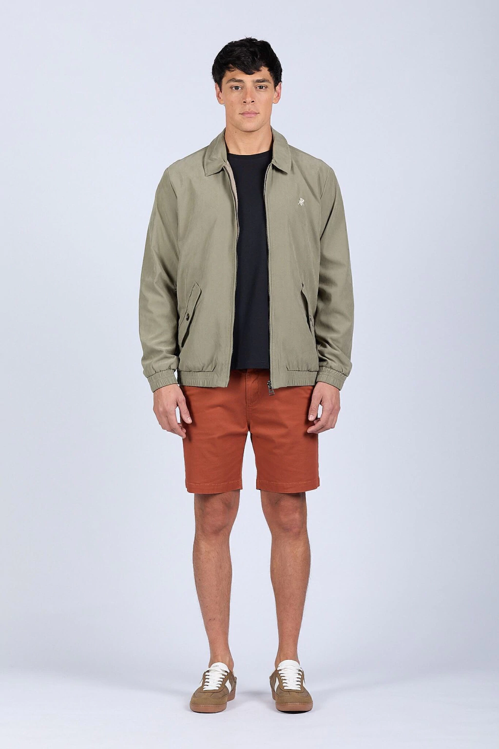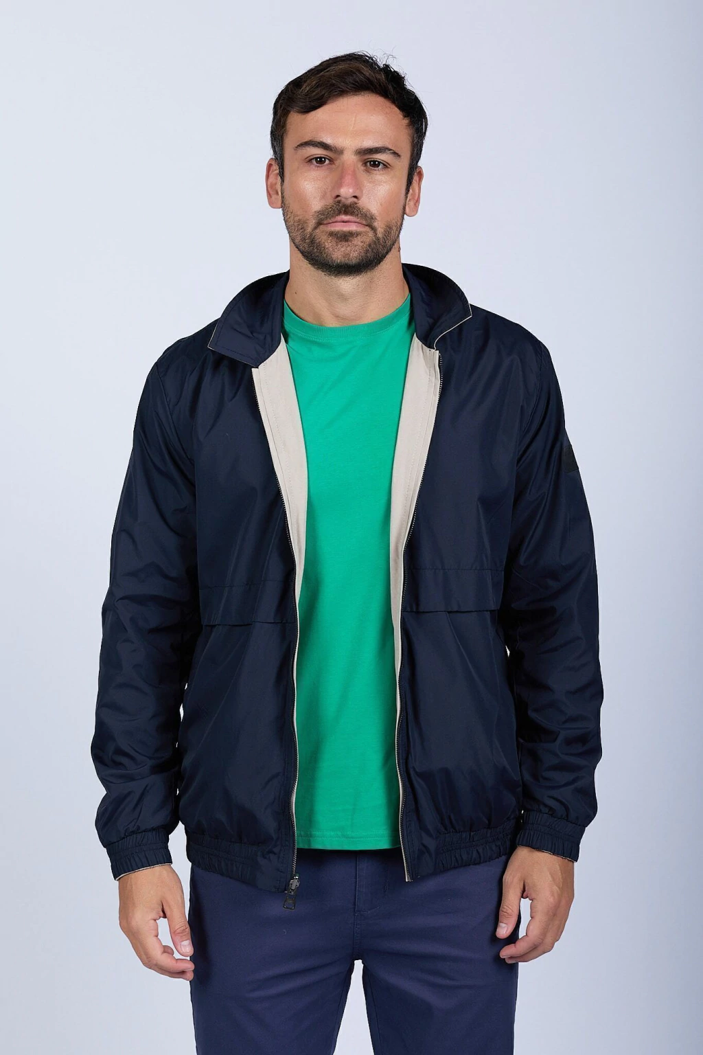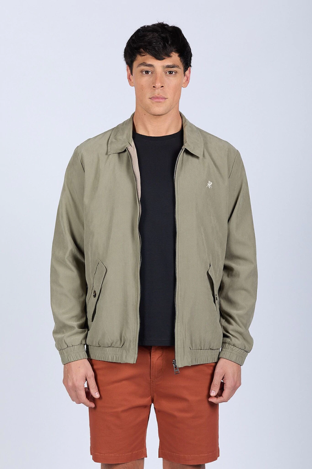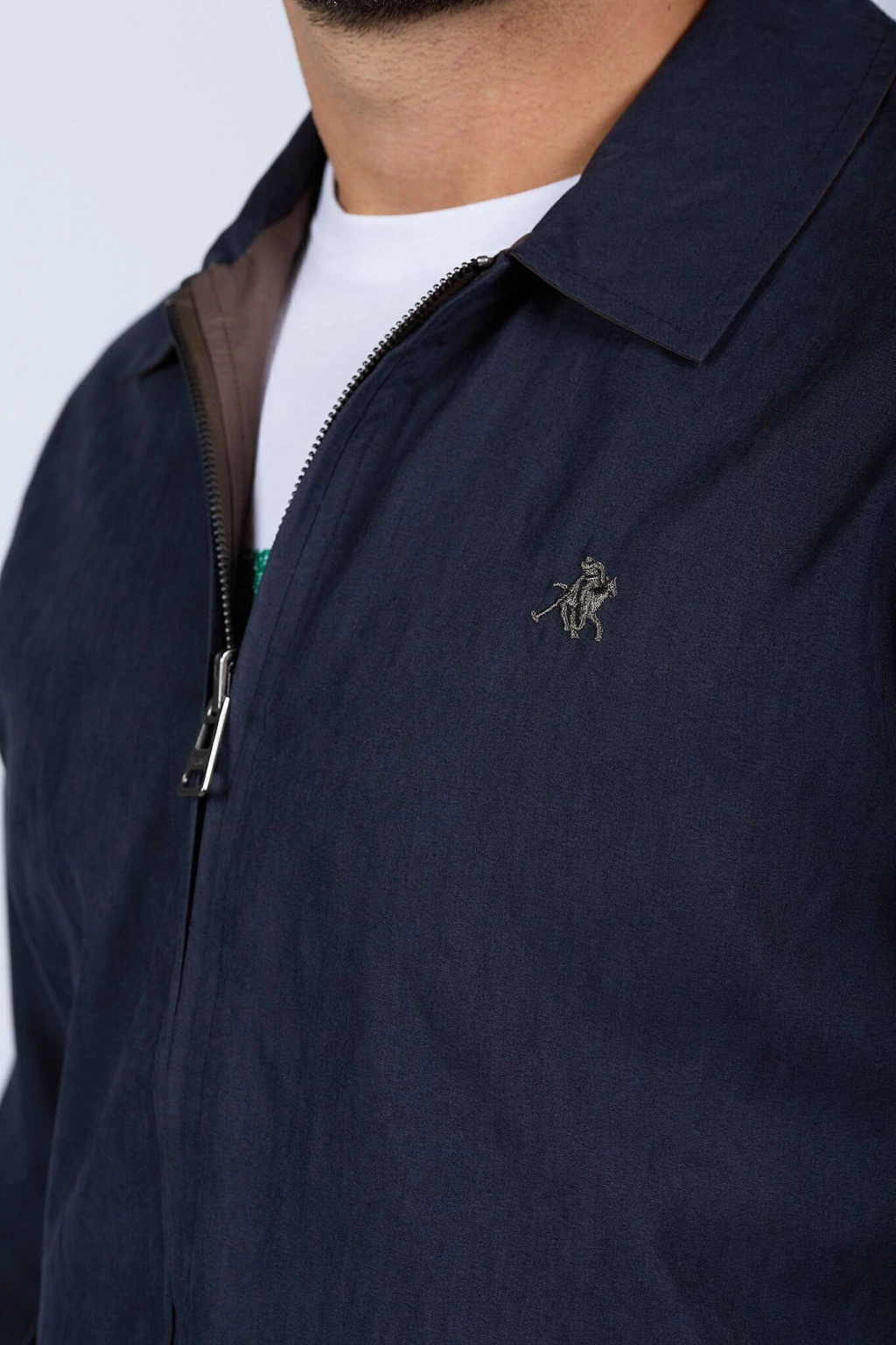 Campera bomber liviana reversible. Su lado gamuzado proporciona un look elegante y sofisticado, mientras que el reversible en microfibra resiste las lluvias, ideal para adaptarse a diferentes ocasiones. Cierre metálico. Logo bordado y chapita metálica de marca. Ajustes en puños y cintura.