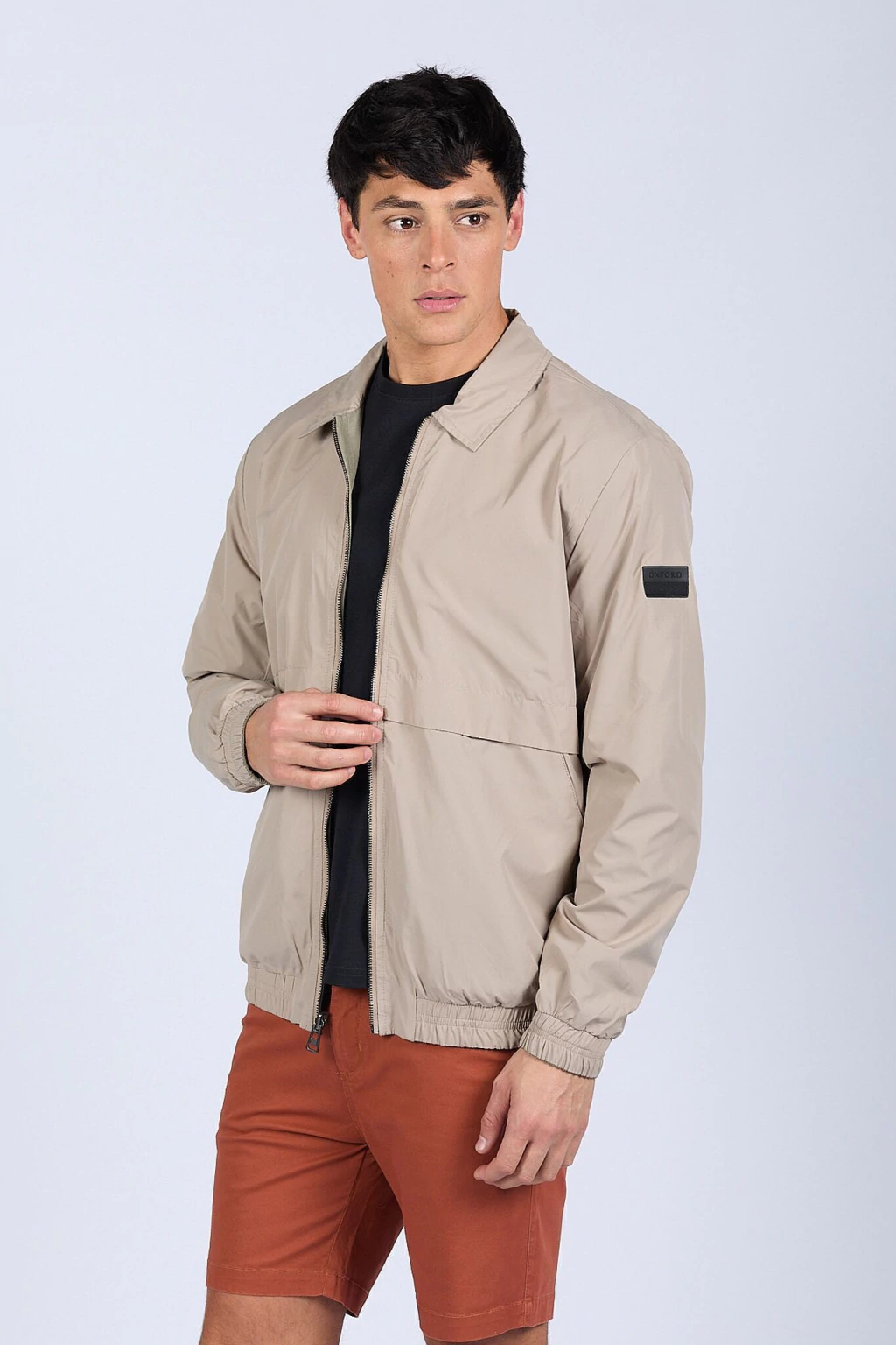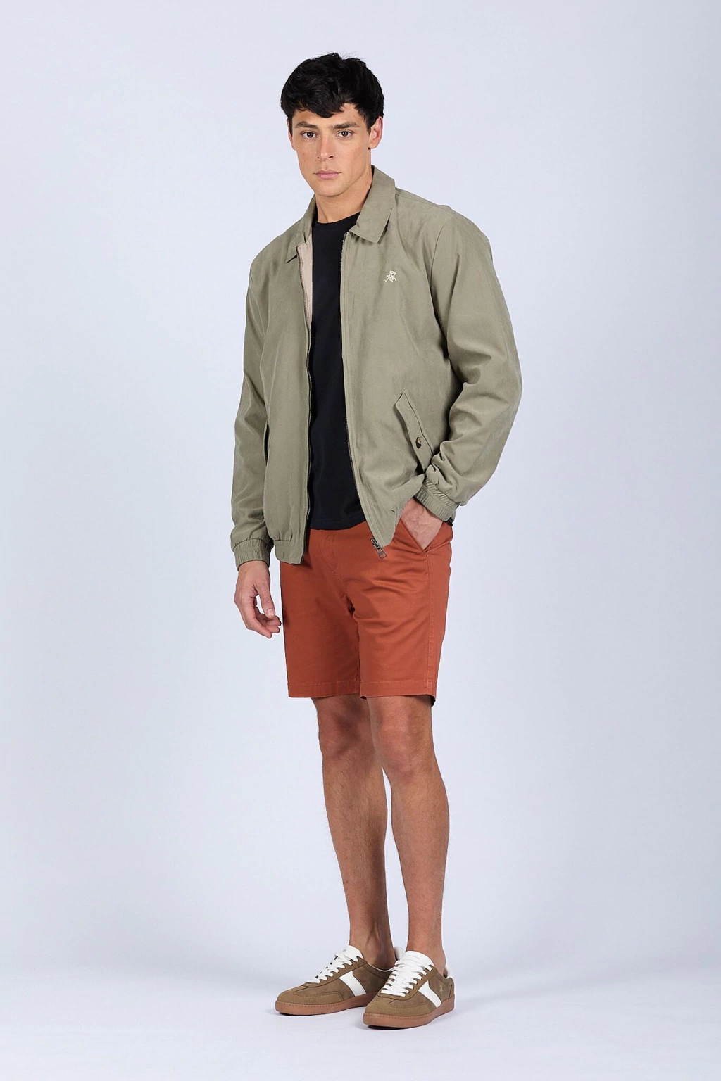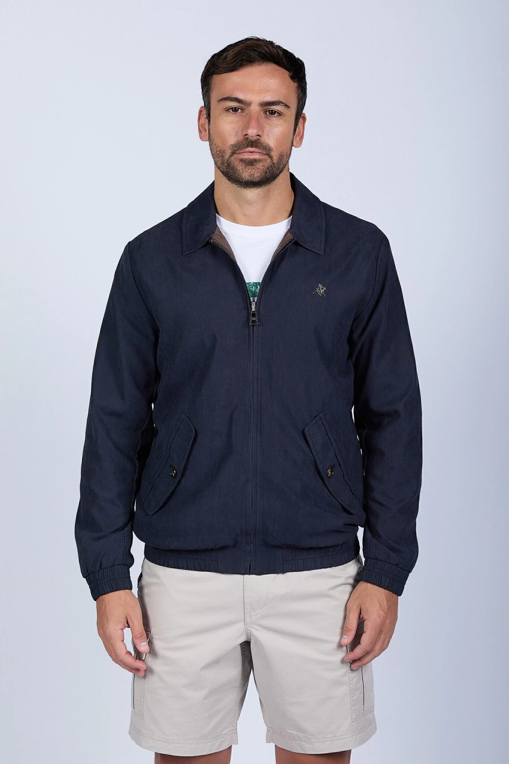 Campera bomber liviana reversible. Su lado gamuzado proporciona un look elegante y sofisticado, mientras que el reversible en microfibra resiste las lluvias, ideal para adaptarse a diferentes ocasiones. Cierre metálico. Logo bordado y chapita metálica de marca. Ajustes en puños y cintura.