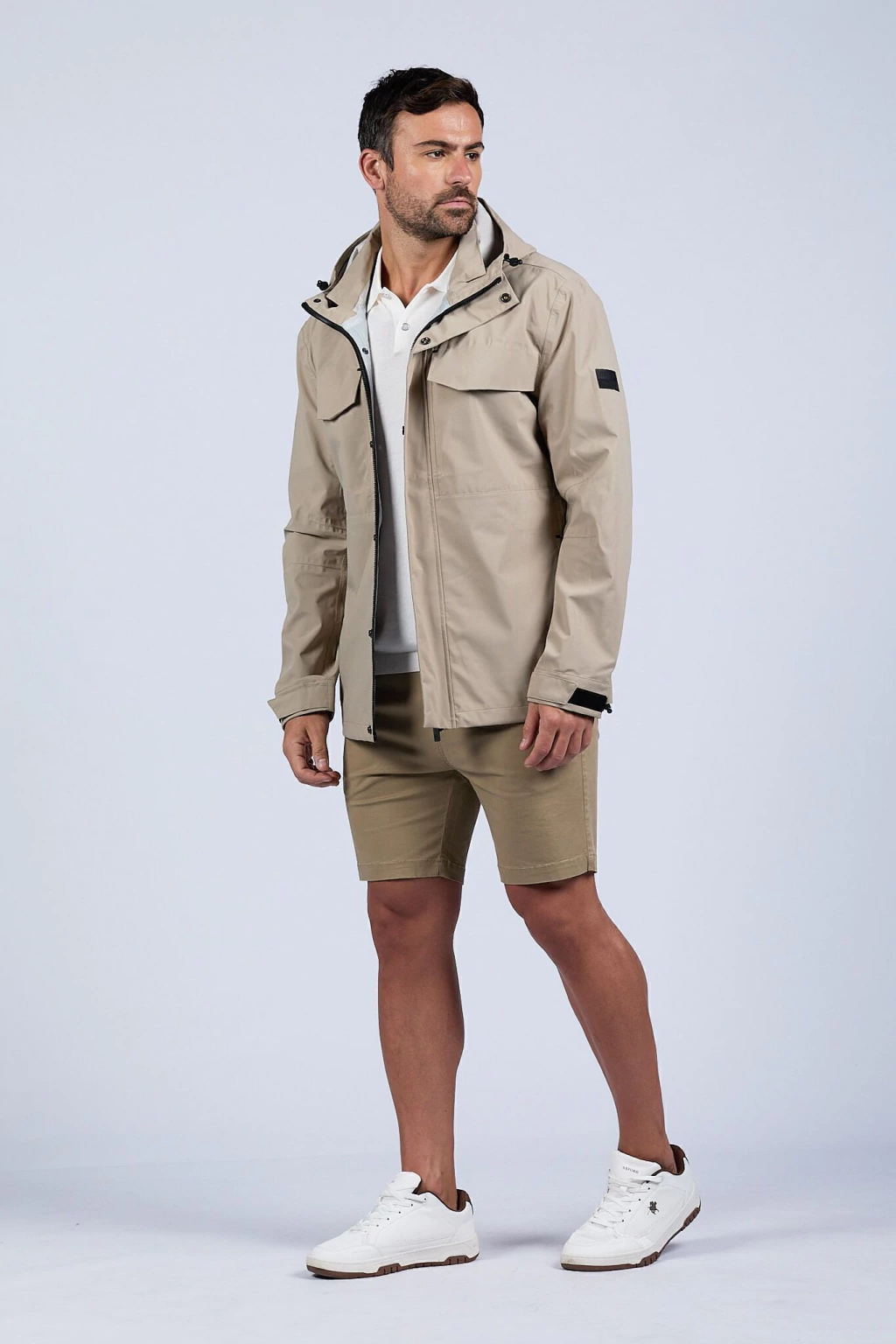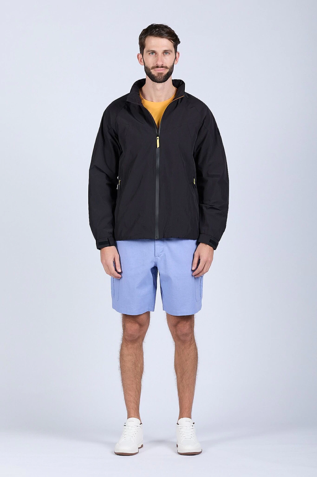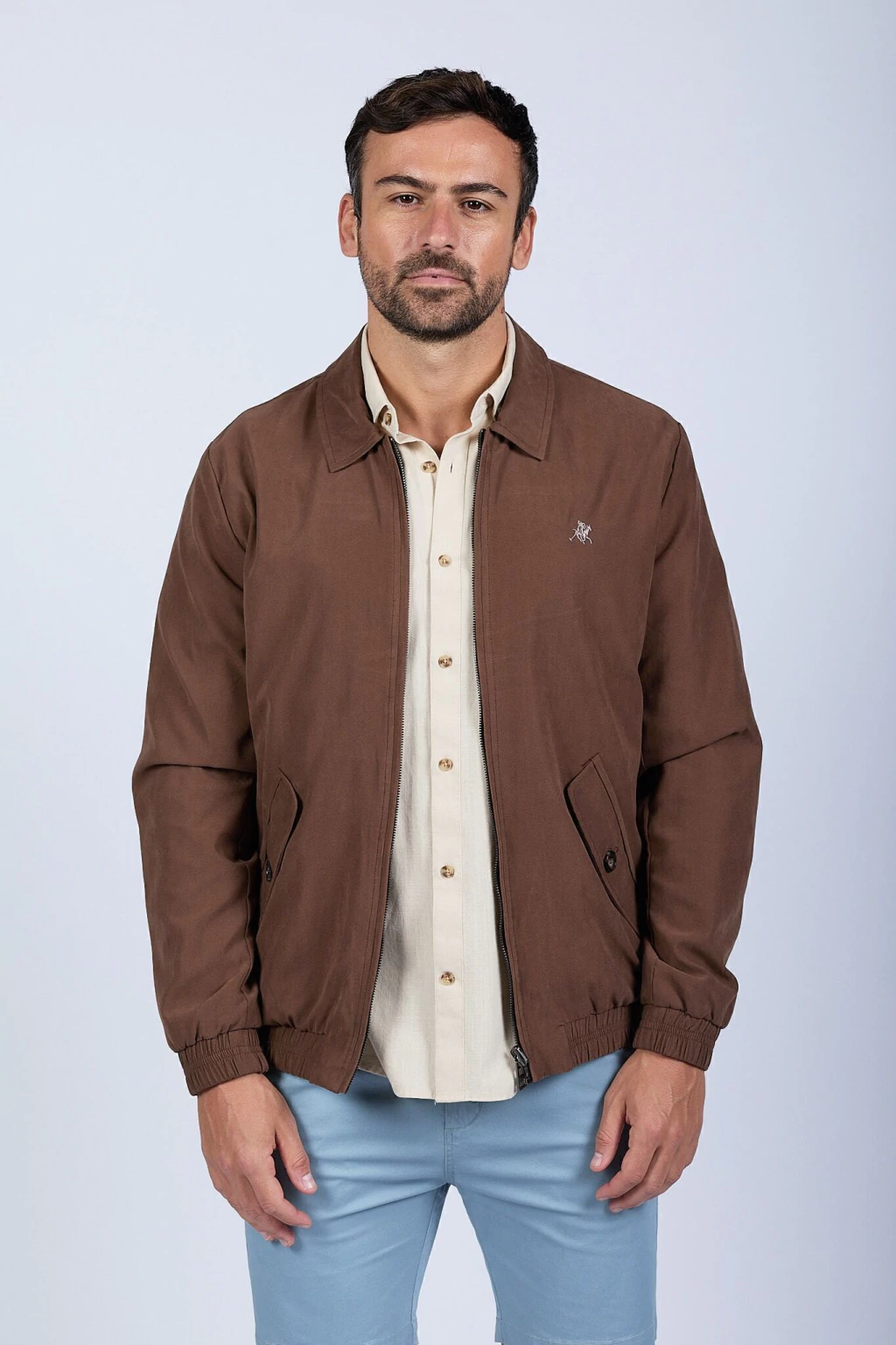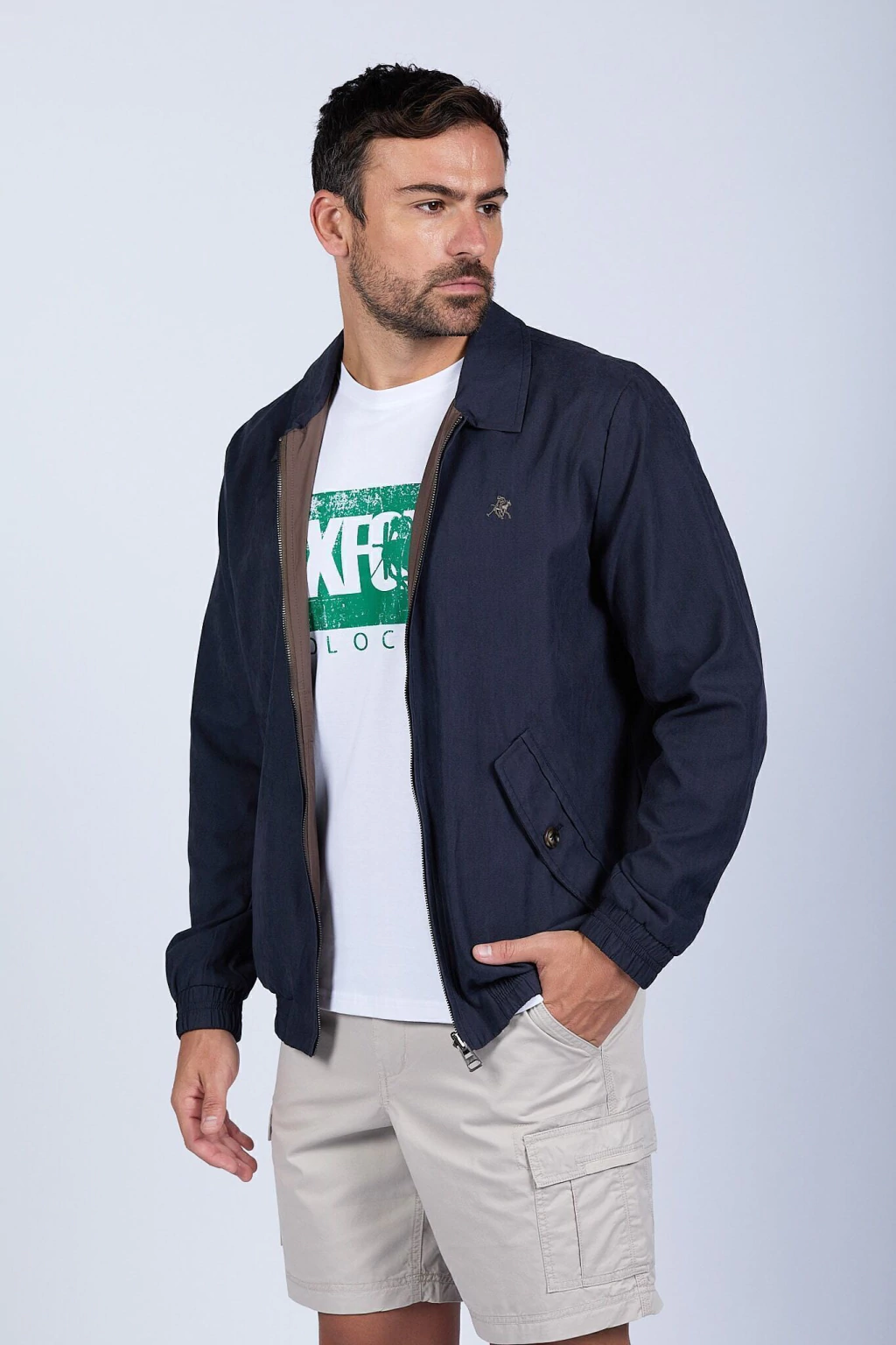 Campera bomber liviana reversible. Su lado gamuzado proporciona un look elegante y sofisticado, mientras que el reversible en microfibra resiste las lluvias, ideal para adaptarse a diferentes ocasiones. Cierre metálico. Logo bordado y chapita metálica de marca. Ajustes en puños y cintura.